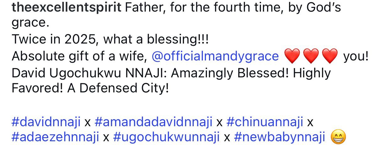 Actor David Nnaji and wife, Mandy, have welcome a second child months after welcoming a baby boy in February this year. The acfor shared the good news on social media today December 15. In his post, he promised to ensure Mandy rests in the next two years after going through labour twice in a year.Father, for the fourth time, by Gods grace.Twice in 2025, what a blessing!!!Absolute gift of a wife, @officialmandygrace you!David Ugochukwu NNAJI: Amazingly Blessed! Highly Favored! A Defensed City!Christ paid the price for meBlood speaks mercy prevailsOh, wondrous love of ChristAnd its everlasting!My past no longer mineMade new on this I standSure mercies I receiveAnd its new every morning!#Love you wifey @officialmandygraceTwo bundles of joy in 2025!I truly will make sure you rest for two years, atleast'' David used to be married to singer Jodie and they have one son together. He later remarried Mandy and they have three children now together! Congrats to them!