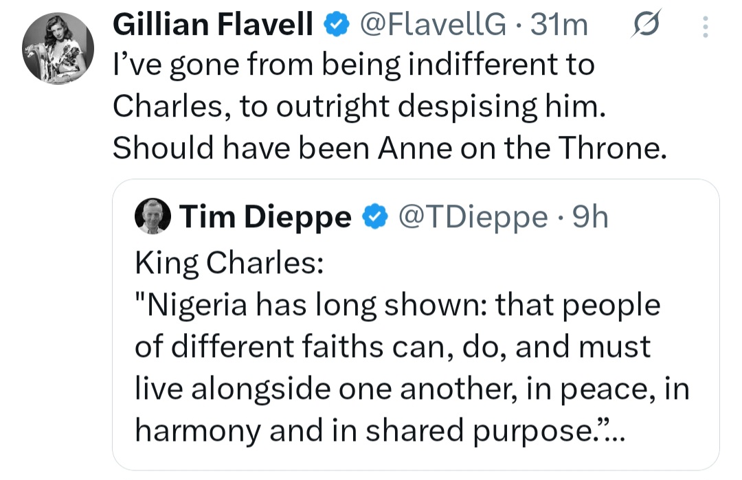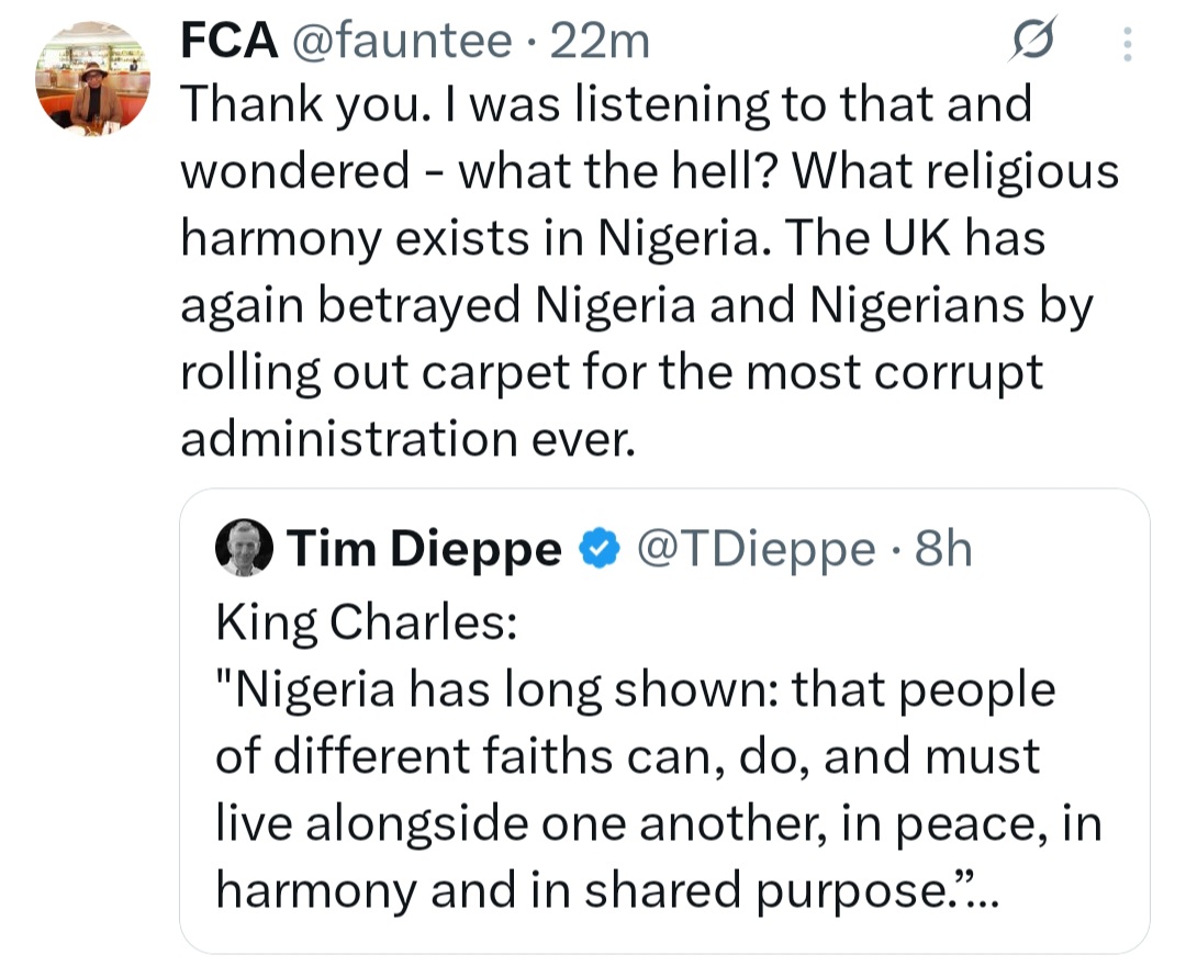 King Charles is facing backlash from his subject over a statement he made at the State Banquet hosting Nigeria's President Bola Ahmed Tinubu and wife Remi Tinubu. Speaking during the banquet which held at St. Georges Hall in Windsor Castle, the British monarch said: "Nigeria has long shown: that people of different faiths can, do, and must live alongside one another, in peace, in harmony and in shared purpose." This part of his statement was shared on X and led to criticisms from Brits. Tim Dieppe, Head of Public Policy at Christian Concern, wrote: "Does he have no idea of the level of persecution of Christians in Nigeria?" Brit John Bortho also reacted, writing: "Christians are being slaughtered in Nigeria. Ours is a Christian country and always will be. You are Defender of the Faith, Charles. Do your job! We built this country not your muslim chums. We English were made to endure. You cant erase us." "Christians are slaughtered en masse in Nigeria. King Charles is profoundly misguided," David Vance wrote. "And here we have the King of England willfully ignoring the genocide of Christians in Nigeria," Huckleberry added. Nigerians also reacted on the post."Im sure the king is just reading the script given to him without actually knowing the reality of what he is talking about," Ola Dammy wrote. See some comments below.