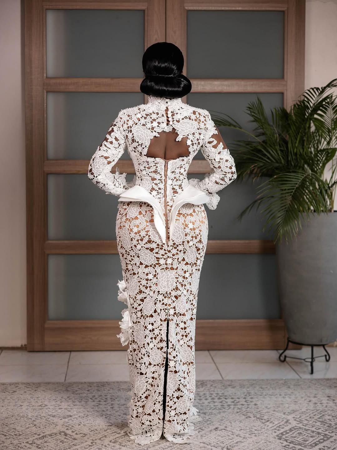 To execute this show-stopping effect, Turquoise Haute Couture has crafted a stunning white lace ensemble that’s truly breathtaking. Featuring exquisite lace petal patterns across the entire silhouette, a daring plunging neckline, and a striking layered waistline… this dress is pure elegance. Hair by Angee delivered a sleek side-swept low bun that adds even more beauty and radiance to the look. The soft, luminous makeup by Dher By Brown Beauty completes the ensemble with a gorgeous, glowing finish. If you’re a bride seeking sophistication and distinctive elegance, then this look deserves a spot at the top of your list — bold, beautiful, and exceptional.