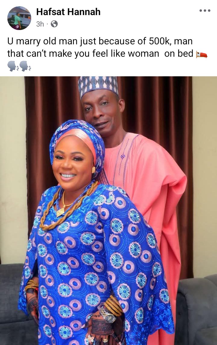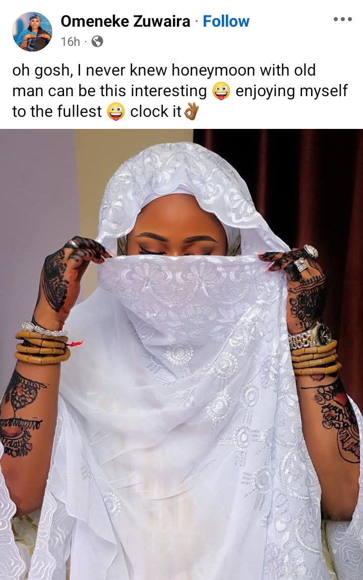 A newly married Nigerian woman, Omeneke Zuwaira, has fired back at people targeting her husband, saying he's too old and won't satisfy her in bed. A Facebook user, Hafsat Hannah, shared Zuwaira' wedding photo, writing; U married an old man just because of N500k. Man that can't make you feel like a woman in bed." Reacting to the trolling, Zuwaira shared photos with her man, saying he is a husband material who she loves dearly and would stcick with even if he were 150 years old. "Alhamdulillah Alhamdulilah Alhamdulilah. My wedding was a huge success. All thanks to my darling, caring husband. This is what we call husband material. Even if he is a 150 years old man, I'm okay with it. Clock it," she wrote.