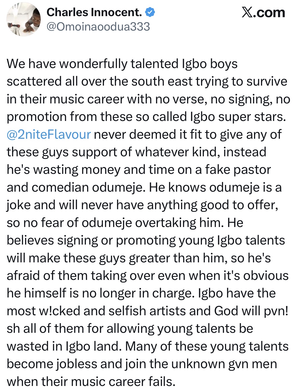 Singer Flavour has clapped back at an X-user who accused him of refusing to sign young and talented Igbo singers just because he doesn't want them to outshine him. The X-user called out Flavour following his recent musical collaboration with a Nigerian cleric, arguing that Flavour featured the cleric because he knows the cleric has nothing to offer and is not a threat to his musical career. He went further to say that Flavour has refused to collaborate with young and talented Igbo singers because he is scared they will displace him. Flavour spotted the comment and responded. See their exchange below