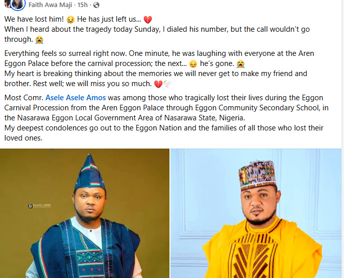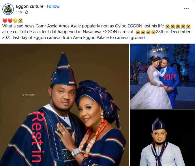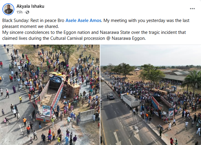Four persons have been confirmed d3ad, while seven others sustained varying degrees of injuries when three trucks rammed into a crowd during a procession at the annual Eggon Festival and Carnival, in Nasarawa Eggon Local Government Area of Nasarawa State. The incident occurred during the festival held at the Eggon Community Secondary School on Sunday, December 28, throwing the usually colourful celebration into mourning. Confirming the accident, the Corps Commander of the Federal Road Safety Corps (FRSC), Yahaya Sabo, said the crash was caused by reckless driving, adding that investigations were ongoing. Eyewitnesses described the incident as tragic and avoidable, blaming the truck drivers for failing to exercise caution in the crowded festival environment. The bodies of the deceased have been deposited at the Federal University of Lafia Teaching Hospital, while those injured are currently receiving medical treatment at the General Hospital in Nasarawa Eggon. Two of the victims were identified as Asheazi Musa and Comrade Asele Amos Asele, popularly known as Oyibo Eggon.