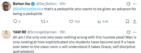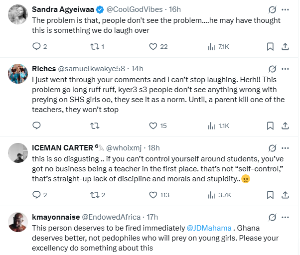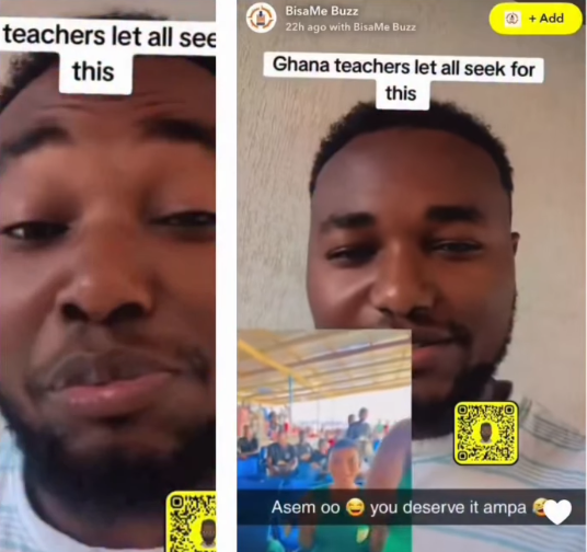 Ghanaians have taken to social media to react after a video of a male teacher seeking for a special government allowance for male teachers made the rounds on social media. In the trending video, the male teacher asked the government to pay him and other male teachers for maintaining their self-control over the Senior High School girls who are becoming increasingly attractive as the day goes by. In his wordsThe Minister of Education, I stand for my colleagues, in fact we deserve self-control allowance. Teachers, we deserve self-control allowance because looking at these young girls nowadays, teachers are suffering. Ghana teachers, we are suffering, We deserve self-control allowance because it is not easy.It is not easy for teachers to control himself for three good years, teaching these kids because nowadays the kind of food they are eating, the kind of body hugs they are putting on, it makes them look attractive but they are very young and it is not easy for us to control ourselves.'' he saidHis comments has elicited reactions from many Ghanaians. While some do not see anything wrong in what he said, others demand for his arrest and prosecution.