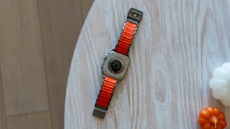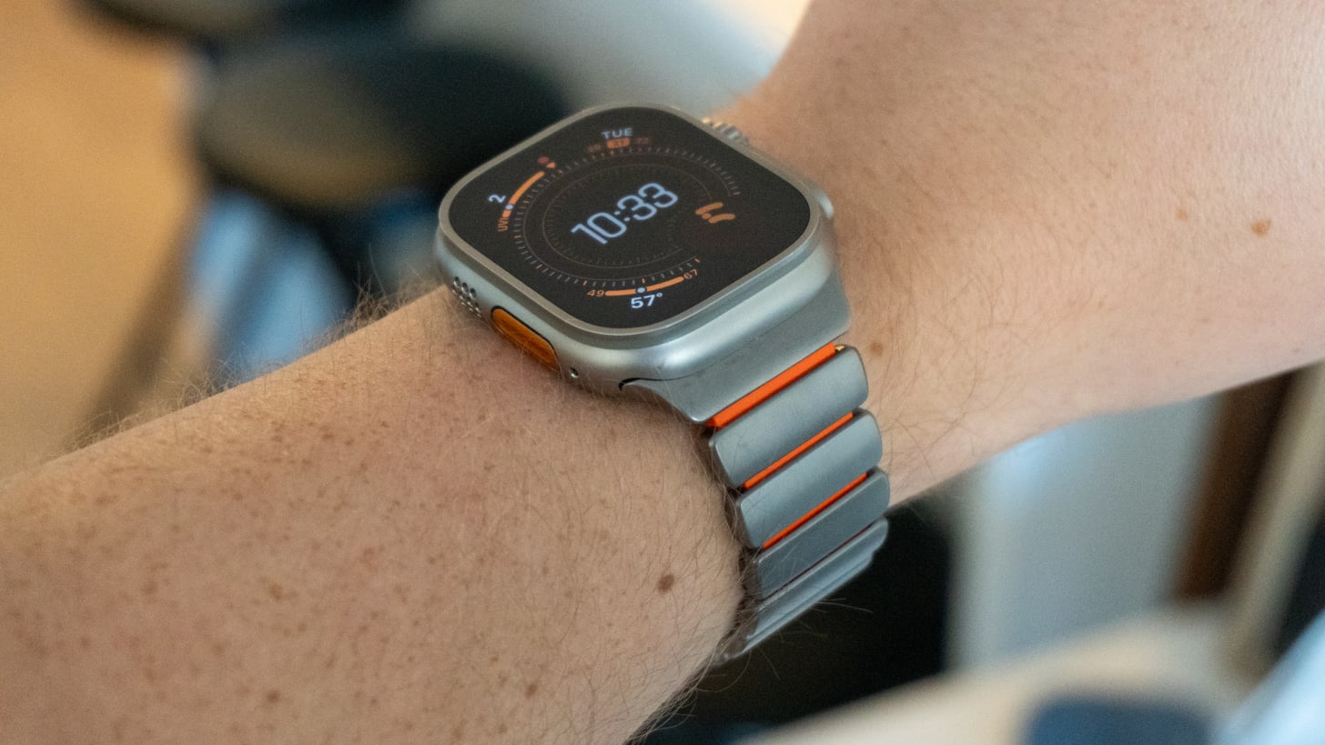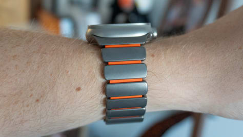 📐 Fit and finish. You can add and remove all the links you need to help the Stratos band fit your wrist. I had to take two links out and add a half-size link, which is included in the box. It’s an easy process removing links, too: the tool you need is in the box, and each pin is spring-loaded so you can snap them back together without needing to hammer them in, like with other link bracelets. The Stratos band is available in Silver or Carbide titanium to match your Apple Watch Ultra’s finish, and rubber options include Black, Volt, and Ultra Orange. I was sent two Silver bands with orange and black rubber, and they both look stunning. So far, my favorite is the Ultra Orange model.