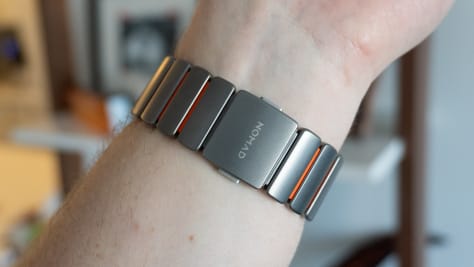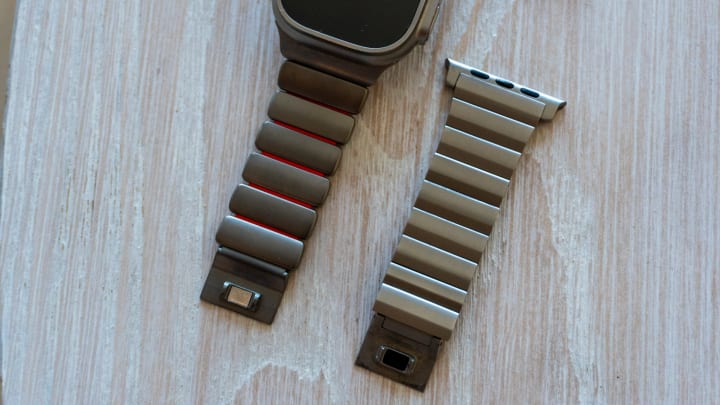🤩 As premium as it gets. Nomad says it spent two years creating the Stratos band, and the result is a band that’s as premium as the rest of the company’s accessories. The Grade 4 titanium links attach to FKM rubber that sits on the inside of the band to make it more comfortable on your wrist. The rubber peaks through the titanium that accents the metal in a unique way, creating a look that’s a bit more sporty than formal like Nomad’s traditional titanium band.