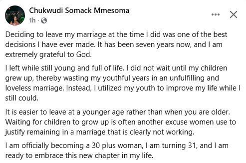A Nigerian woman, Chukwudi Mmesoma, has said that leaving her loveless marriage at 24 remains one of the best decisions she has ever made.   The mother of two, who stated this in a Facebook post on Thursday, said if she had waited until her children grew up, she would have wasted her youthful years.   According to the businesswoman, most women use their young children as excuse to stay in unhappy marriages.  Deciding to leave my marriage at the time I did was one of the best decisions I have ever made. It has been seven years now, and I am extremely grateful to God, she wrote.  I left while still young and full of life. I did not wait until my children grew up, thereby wasting my youthful years in an unfulfilling and loveless marriage. Instead, I utilized my youth to improve my life while I still could. It is easier to leave at a younger age rather than when you are older. Waiting for children to grow up is often another excuse women use to justify remaining in a marriage that is clearly not working. I am officially becoming a 30 plus woman, I am turning 31, and I am ready to embrace this new chapter in my life," she wrote.  She recalled being told that she will eventually get tired and go running back to her marriage Were you told that you will get tired and run back? Mbanu, not a 24years young, beautiful Woman, that still has enough time to rewrite her wrongs! Its been 7years, and we are 2weeks to 31. November 15th, and we officially become a 30plus Woman, she added.