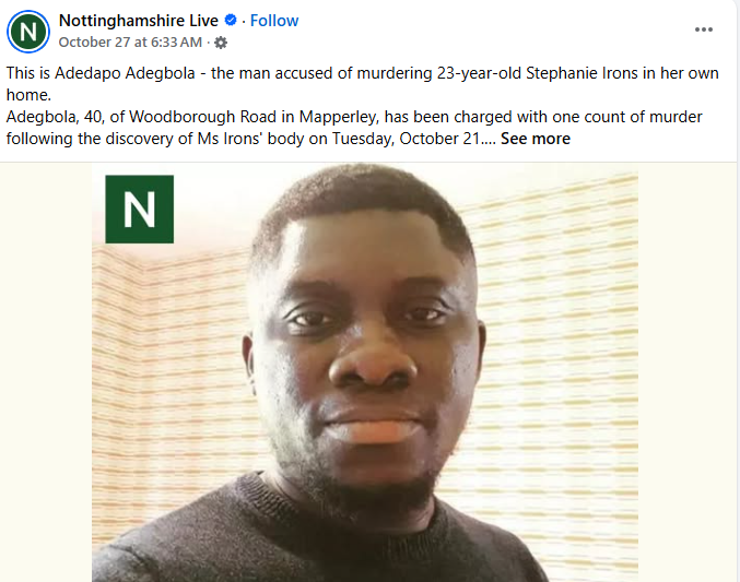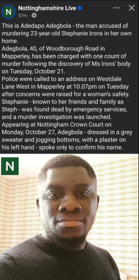 Some Britons have reacted in anger to a Facebook post by a Nigerian man, Adegbola Adedapo, who was arrested for the m8rder of a 23-year-old woman, Stephanie Irons in the UK.  Adegbola, 40, was charged with one count of m8rder after Stephanie's body was discovered on Tuesday, October 21, 2025.   He appeared in court for the first time on Saturday, October 25.   In a Facebook post dated October 19, 2024, Adegbola wrote: At some point in life, you have to be okay with being the bad guy and never getting a chance to tell your own side. Anyone who will judge based off a single story is not who you want to be explaining yourself to anyway.  The post elicited angry reactions from Britons, with some of them hauling abuses at Adegbola, calling him a m8rderer. M8RDERING Bastard hope you get what's coming to you!!!! Actually disgusting, one Jake James wrote.  Lets see how our English prison treat a woman m8rdering scumbag like you, George Swain wrote.  Well you certainly lived up to your status of being a bad guy didnt you. You m8rdering bastard. I hope you never see daylight ever again. RIP to the poor girl whose life you ended!!! Your scum, lets see how you like life in a English prison, Louise Gunning wrote.