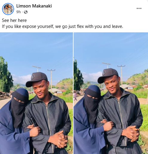 A Kogi man, Limson Makanaki, shared photos with a woman wearing a niqab. See her here. If you like expose yourself, we go just flex with you and leave, he captioned the post.