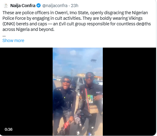 The police in Imo state says it has begun an investigation into the viral video of some of its officers allegedly involved in cult activities. An X user @Naijaconfraternity had shared the video calling out the officers.
