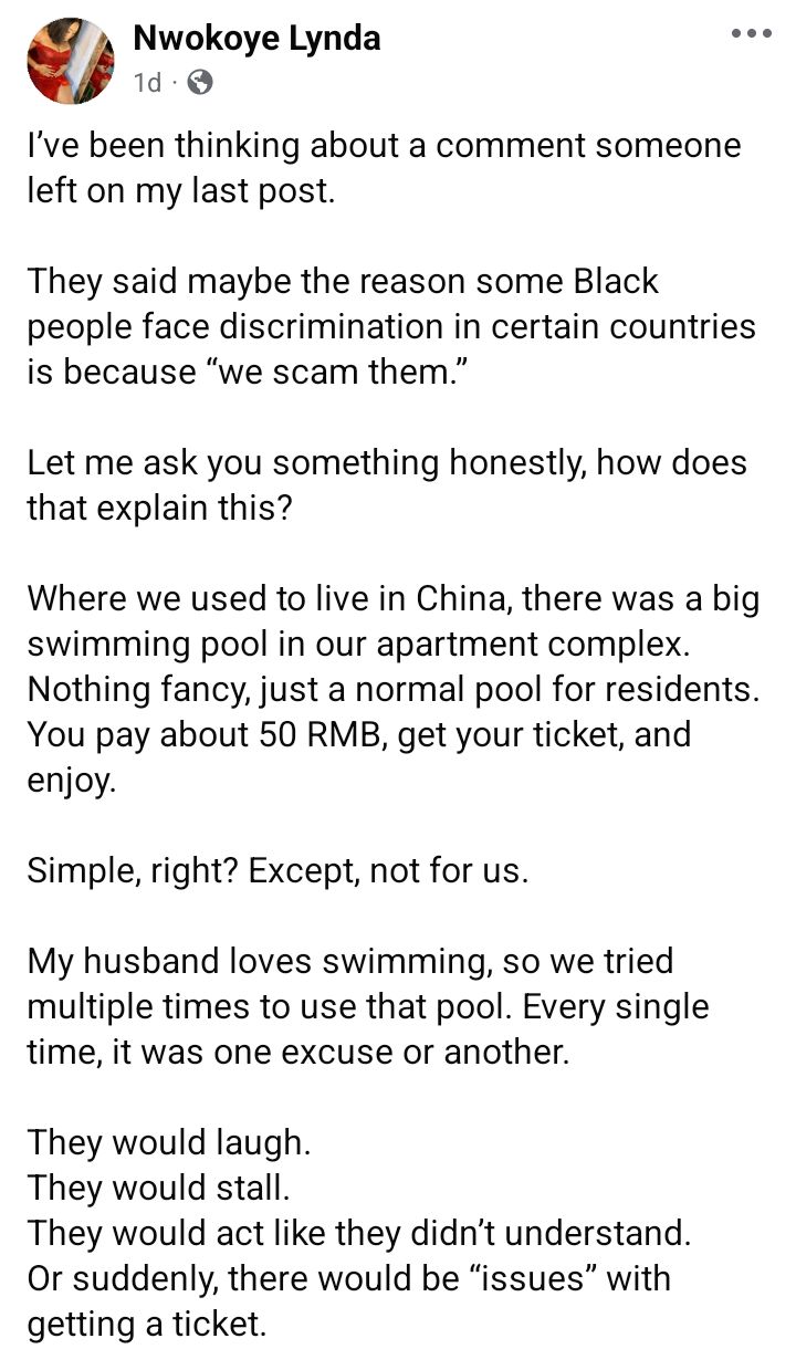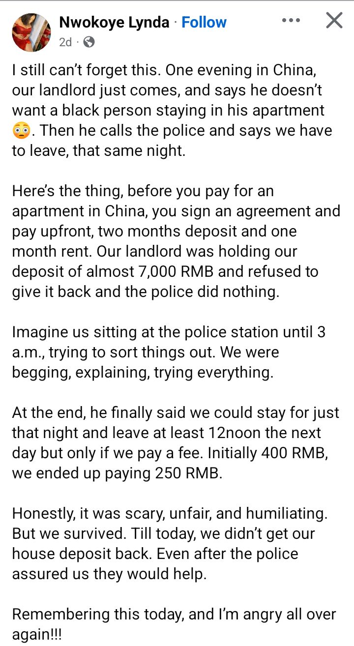 A Nigerian lady, Nwokoye Lynda, has recalled when a Chinese landlord told her and other tenants to vacate his apartment in China without prior notice, saying he didn't want a black person. Nwokoye, who disclosed this in a Facebook post two days ago described the incident as scary, unfair, and humiliating. According to Nwokoye, the landlord refused to refund their house deposit of 7,000 RMB and called the police on them. At the police station, they pleaded for more time and the landlord grudgingly agreed to let them stay for that night and leave the next day. Nwokoye also revealed that they were not allowed to use the swimming pool in another apartment complex they lived. According to her, all attempts to make use of the pool were met with excuses and laughter. "I still cant forget this. One evening in China, our landlord just comes, and says he doesnt want a black person staying in his apartment. Then he calls the police and says we have to leave, that same night, she wrote. Heres the thing, before you pay for an apartment in China, you sign an agreement and pay upfront, two months deposit and one month rent. Our landlord was holding our deposit of almost 7,000 RMB and refused to give it back and the police did nothing. Imagine us sitting at the police station until 3 a.m., trying to sort things out. We were begging, explaining, trying everything. At the end, he finally said we could stay for just that night and leave at least 12noon the next day but only if we pay a fee. Initially 400 RMB, we ended up paying 250 RMB. Honestly, it was scary, unfair, and humiliating. But we survived. Till today, we didnt get our house deposit back. Even after the police assured us they would help. Remembering this today, and Im angry all over again!!!