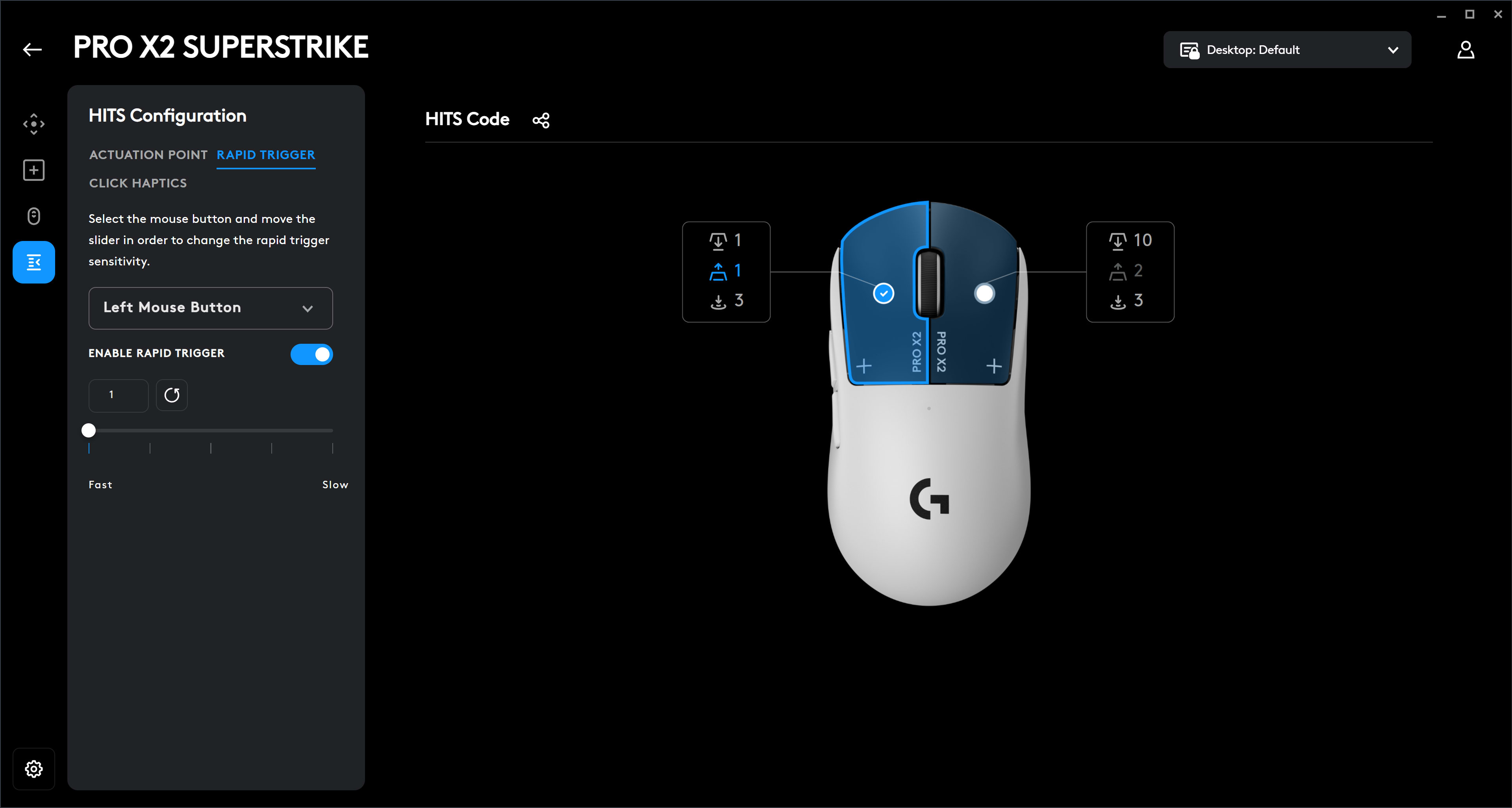 🔨 Logitech G Hub lets you tweak and customize. Logitech’s G Hub software lets you customize the Superstrike mouse to your heart’s content. You can adjust the haptics, activate Rapid Trigger, change the polling rate, lift off distance, and set the left and right mouse button to your liking. I personally used the lowest actuation setting and Rapid Trigger on the left mouse button only, and set up the right mouse button to function more like a traditional mouse. You can also share your settings or choose from a list of curated presets to suit the game you’re playing.