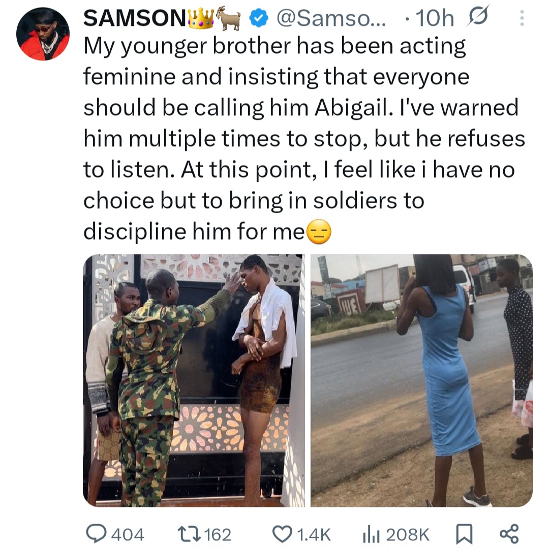 A man called a Nigerian soldier to discipline his brother who acts feminine. The brother who called the soldier took to X to complain about his brother's behaviour which resulted in him involving a soldier. He shared a photo of a uniformed man confronting his cross-dressing brother and wrote: "My younger brother has been acting feminine and insisting that everyone should be calling him Abigail. I've warned him multiple times to stop, but he refuses to listen. At this point, I feel like i have no choice but to bring in soldiers to discipline him for me"