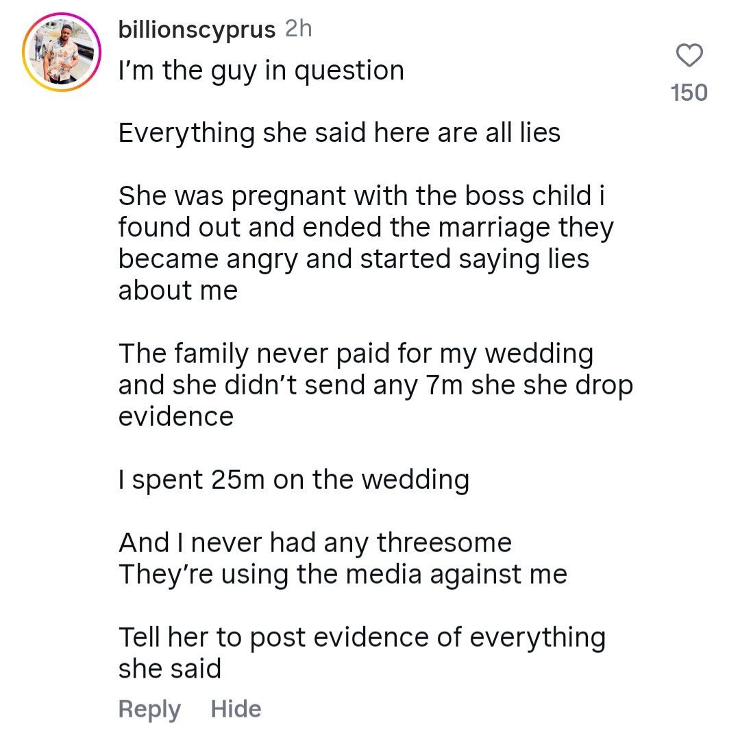The man whose ex-wife accused of requesting threesome, leading to the end of their marriage, has spoken out with his side of the story. Uchechi Sandra Nnenne had gone on TikTok to share why her marriage ended on Jan. 6, 2025, just two days after her lavish wedding. She claimed her ex-husband told her many lies, then requested to have threesome with her and another woman just one day after her wedding, so she ended the union (read here). The ex-husband, a man named Bobby, has now responded. He denied the allegations made by Uchechi Sandra Nnenne that her family sponsored their wedding which took place on Jan. 4, 2025. According to Bobby, whom Sandra called Mr B in her story, he spent over N25million on their wedding.
