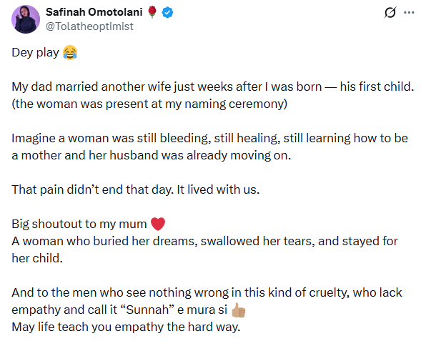 A Nigerian lady, Safinah Omotolani, has revealed that her father married another wife weeks after she was born. She disclosed this after an X user claimed that Yoruba men are not as brutal as their counterparts when it comes to polygamy. The X user stated this after a Nigerian businessman, Scholar, took a second wife nine months after he married his first wife and one week after she gave birth to a set of twins. Dey play. My dad married another wife just weeks after I was born his first child. (the woman was present at my naming ceremony) Imagine a woman was still bleeding, still healing, still learning how to be a mother and her husband was already moving on, Safinah wrote. "That pain didnt end that day. It lived with us. Big shoutout to my mum. A woman who buried her dreams, swallowed her tears, and stayed for her child. And to the men who see nothing wrong in this kind of cruelty, who lack empathy and call it Sunnah e mura si. May life teach you empathy the hard way.