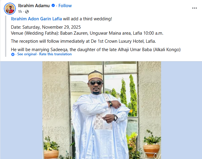 Prince Ibrahim Hassan Abdullahi (Adon Garin Lafia), the Senior Special Assistant on Chieftaincy Affairs to Nasarawa State Governor Abdullahi Sule, is set to take a third wife. According to a notice made available to journalists on Monday, the wedding fatiha is scheduled to hold on Saturday, November 29, 2025, at Baban Zauren, Unguwar Maina area of Lafia at 10:00 am. He also extended an invitation to the members of the public for the wedding between him and Sadeeqa, daughter of late Lafia-based businessman Alhaji Umar Baba (Kongo). Prince Abdullahi is currently married to two wives, Fatima and Husnah.