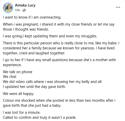 A Nigerian lady, Amaka Lucy, has revealed that she felt betrayed when a close friend she had kept updated about her pregnancy journey turned out to be pregnant at almost the same time but hid it from her. According to Lucy, she got to find out when the friend, who she considered a family, gave birth two months after she ( Amaka) delivered her baby. "I want to know if I am overreacting. When I was pregnant, I shared it with my close friends or let me say those I thought was friends. I was going, I kept updating them and even my struggles," she wrote. There is this particular person who is really close to me, like my babe. I considered her a family because we known for yearssss. I have lived together, cried and laughed together. I go to her if I have any small questions because shes a mother with experience. We talk on phone. We chat. We did video calls where I was showing her my belly and all. I updated her until the day gave birth. We were all happy. Colour me shocked when she posted in less than two months after I gave birth that she just had a baby. I was lost for a minute.Called to confirm and truly it wasnt a prank. Like my babe was pregnant all this while but didnt care to mention it? Never felt so betrayed in my life. I know I am a great friend, I am not even bragging. I am a good friend! Since then weve been communicating, doing business but I cant seem to wave that off my head. She calls and still talk to me like nothing happened but deep down I feel so hurt. I know shell be seeing this here for the first time.