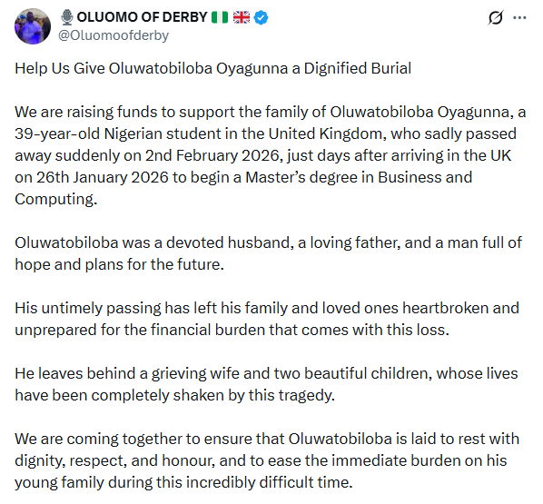 A 39-year-old Nigerian man, Oluwatobiloba Oyagunna, has d!ed seven days after after he relocated to the United Kingdom to further his studies. Oyagunna suddenly passed away on February 2, 2026. He is survived by his wife and two children. The founder of the Nigerians in UK Community, Oluomo of Derby, who disclosed this in a statement on X said Oyagunna arrived in the country on January 26, 2026 to begin a Masters degree in Business and Computing. The statement described the deceased as a devoted husband, a loving father, and a man full of hope and plans for the future The community has set up an GoFundMe account to raise funds to assist his family with the burial expenses. Help Us Give Oluwatobiloba Oyagunna a Dignified Burial We are raising funds to support the family of Oluwatobiloba Oyagunna, a 39-year-old Nigerian student in the United Kingdom, who sadly passed away suddenly on 2nd February 2026, just days after arriving in the UK on 26th January 2026 to begin a Masters degree in Business and Computing, the statement read. "Olluwatobiloba was a devoted husband, a loving father, and a man full of hope and plans for the future. His untimely passing has left his family and loved ones heartbroken and unprepared for the financial burden that comes with this loss. "He leaves behind a grieving wife and two beautiful children, whose lives have been completely shaken by this tragedy. We are coming together to ensure that Oluwatobiloba is laid to rest with dignity, respect, and honour, and to ease the immediate burden on his young family during this incredibly difficult time. We humbly ask for your support. Every donation, no matter how small, makes a difference. If youre unable to give, please consider sharing this appeal. Thank you for your kindness, generosity, and prayers during this time of sorrow.