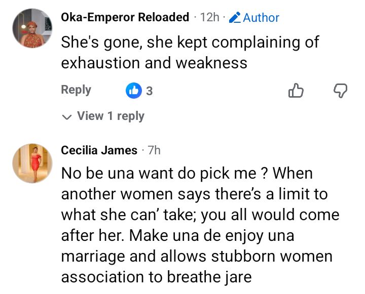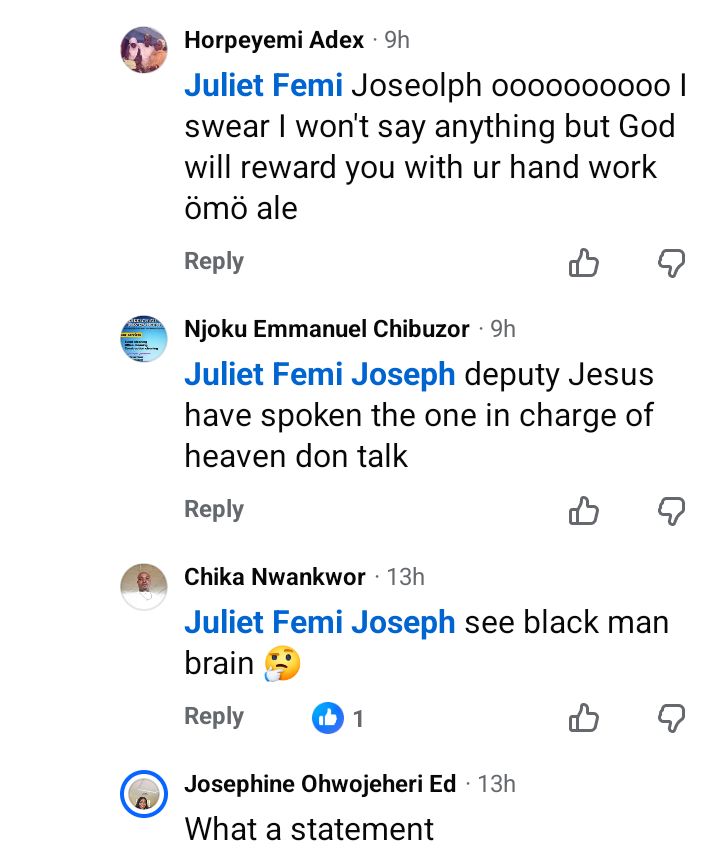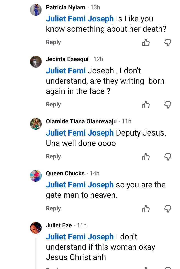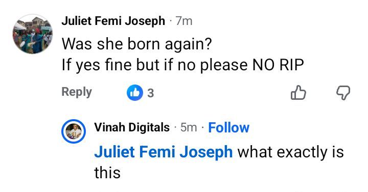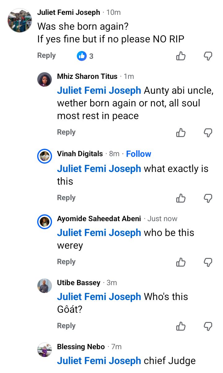 A Nigerian lady, Juliet Femi Joseph, who calls herself God's Vessel has been slammed on Facebook after she said that a businesswoman, Blessing, who reportedly d!ed in her sleep won't rest in peace if she wasn't born again. A friend of the deceased, Okar-Emperor, had announced her d3ath in a Facebook post on Wednesday, February 11, 2026. According to Okar, Blessing had complained of exhaustion and weakness a few days before her d3ath. "Ohh, Blessing, what happened, we were together 4days ago, you weren't s!ck, the shoe you sold to me is still in its pack. That you took a nap and couldn't wake up again is worrisome, unbelievable and unbearable ahhh, uhmm... Jesus, I'm p@ined and lost, what happened??," she wrote. Commenting on the post, God's Vessel wrote: Was she born again? If yes fine but if no, NO RIP"