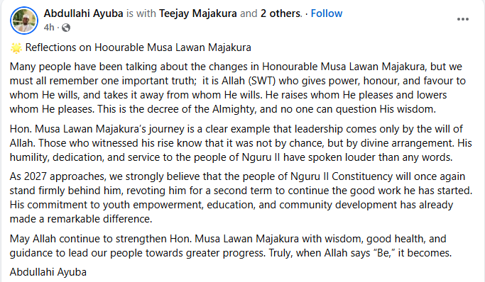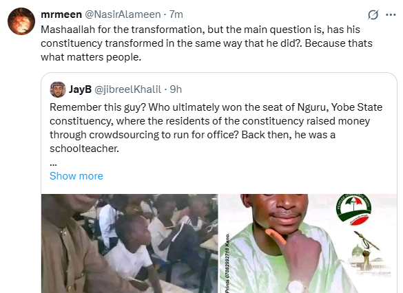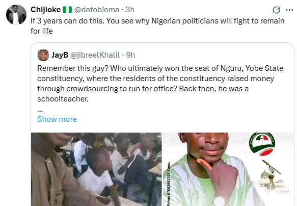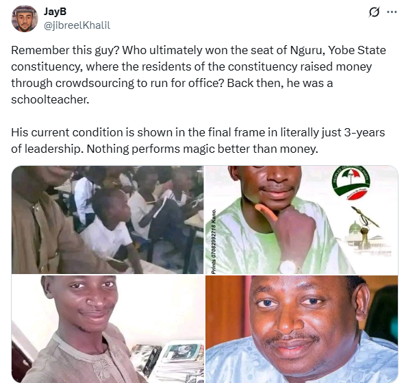 A member of the Yobe State House of Assembly, Honourable Lawan Musa Majakura, has elicited mixed reactions with his jaw-dropping transformation two years after he won election.  Recall that Majakura, a volunteer teacher, made history when he defeated the former Speaker of the Yobe State House of Assembly, Ahmed Mirwa Lawan, in the 2023 State Assembly elections.  Majakura, who won under the platform of the People's Democratic Party, PDP, defected to the All Progressives Congress, APC, in November 2023.  The lawmaker's latest photos have sparked discussion online about poverty and the transformational power of money.    While some criticised Majakura, a few others said that they have no issue with him as long as he is not neglecting people in his constituency.