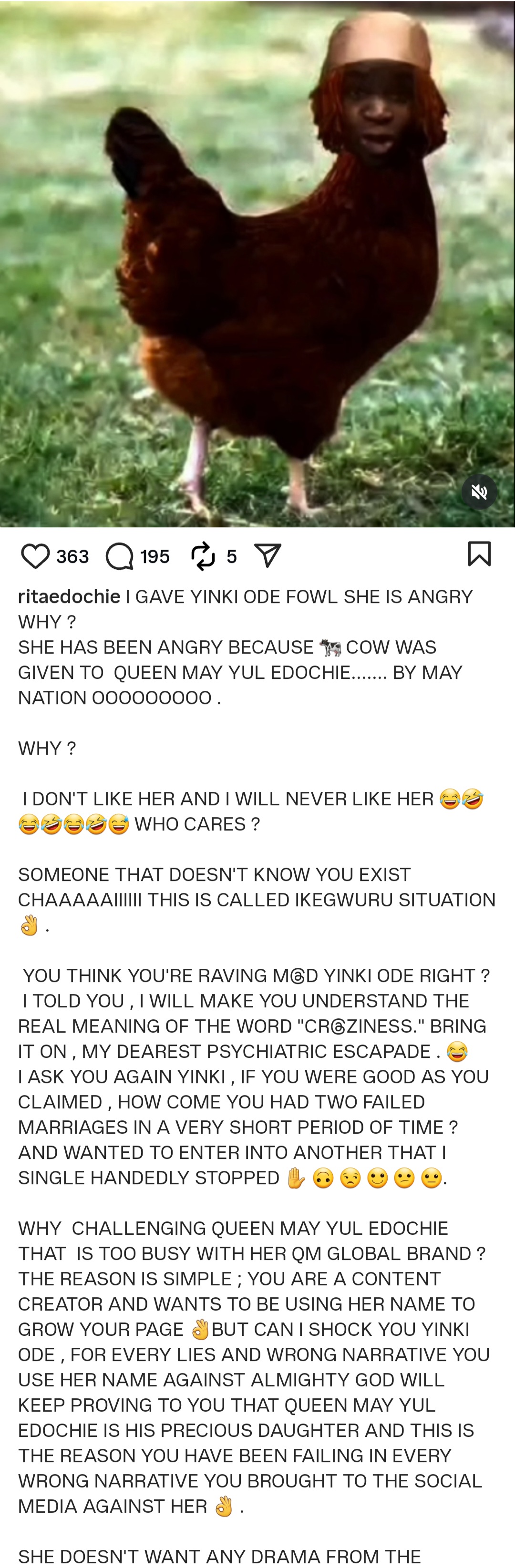Actress Rita Edochie has made a fresh post calling out Yinka Theisen.  Yinka used to be engaged to Linc Edochie,  Rita Edochie's husbands nephew. While in the relationship and since the relationship ended, Yinka has continued calling out May Edochie,  the estranged wife of Linc's younger brother Yul Edochie.  She has also been calling out Rita Edochie. Yinka has publicly blamed May, Rita and May's supporters known as May Nation, for the end of her relationship with Linc.  In a new post, Rita has now blasted Yinka for continuing to call out May and the Edochie family after her relationship with Linc did not work. Rita further stated ways May is better than Yinka as she called Yinka names. See below.