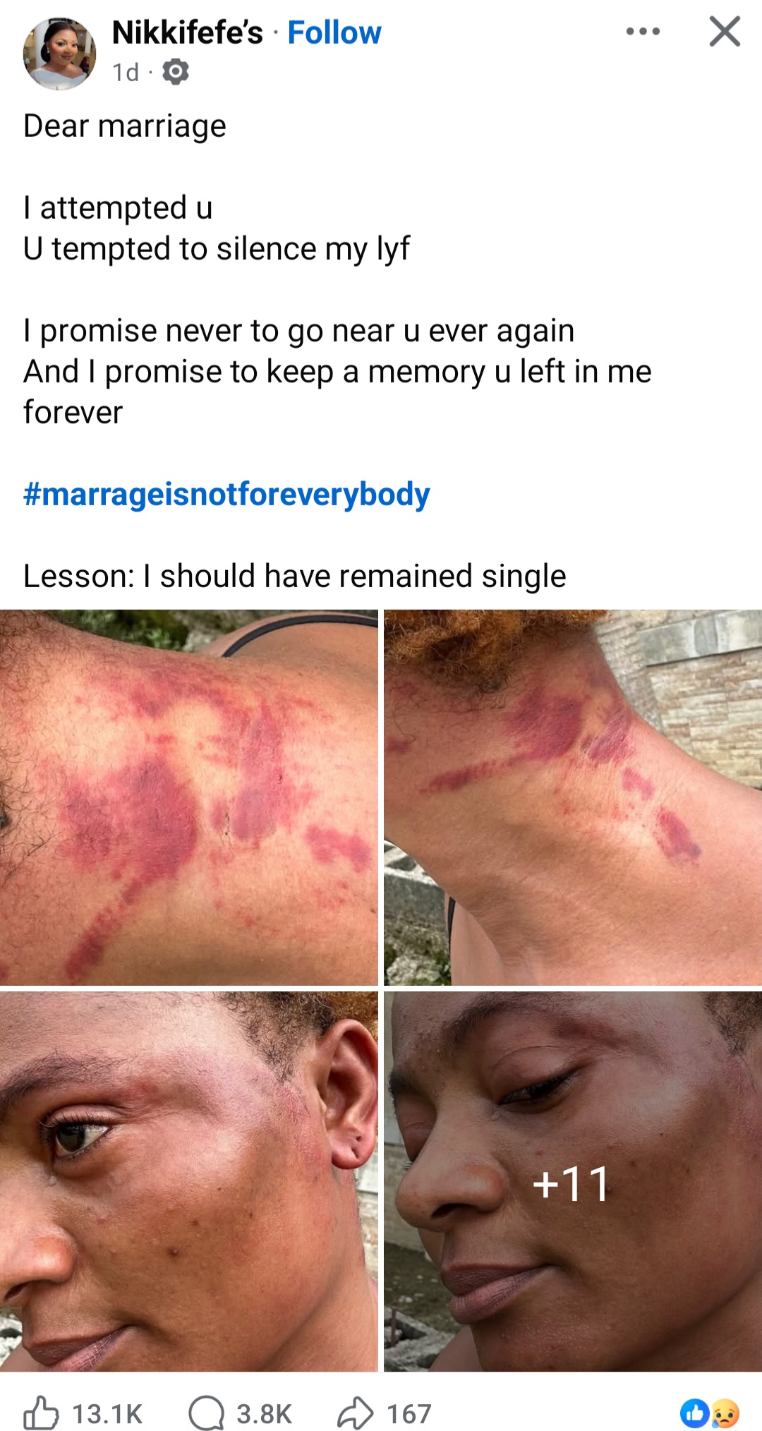 A woman who ended her marriage has vowed never to marry again. The woman took to Facebook to share injuries she sustained as a result of being married. She did not state who inflicted the injury on her. In the caption, she wrote: "Dear marriage "I attempted u. "U tempted to silence my lyf "I promise never to go near u ever again "And I promise to keep a memory u left in me forever #marrageisnotforeverybody "Lesson: I should have remained single."