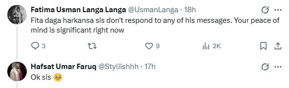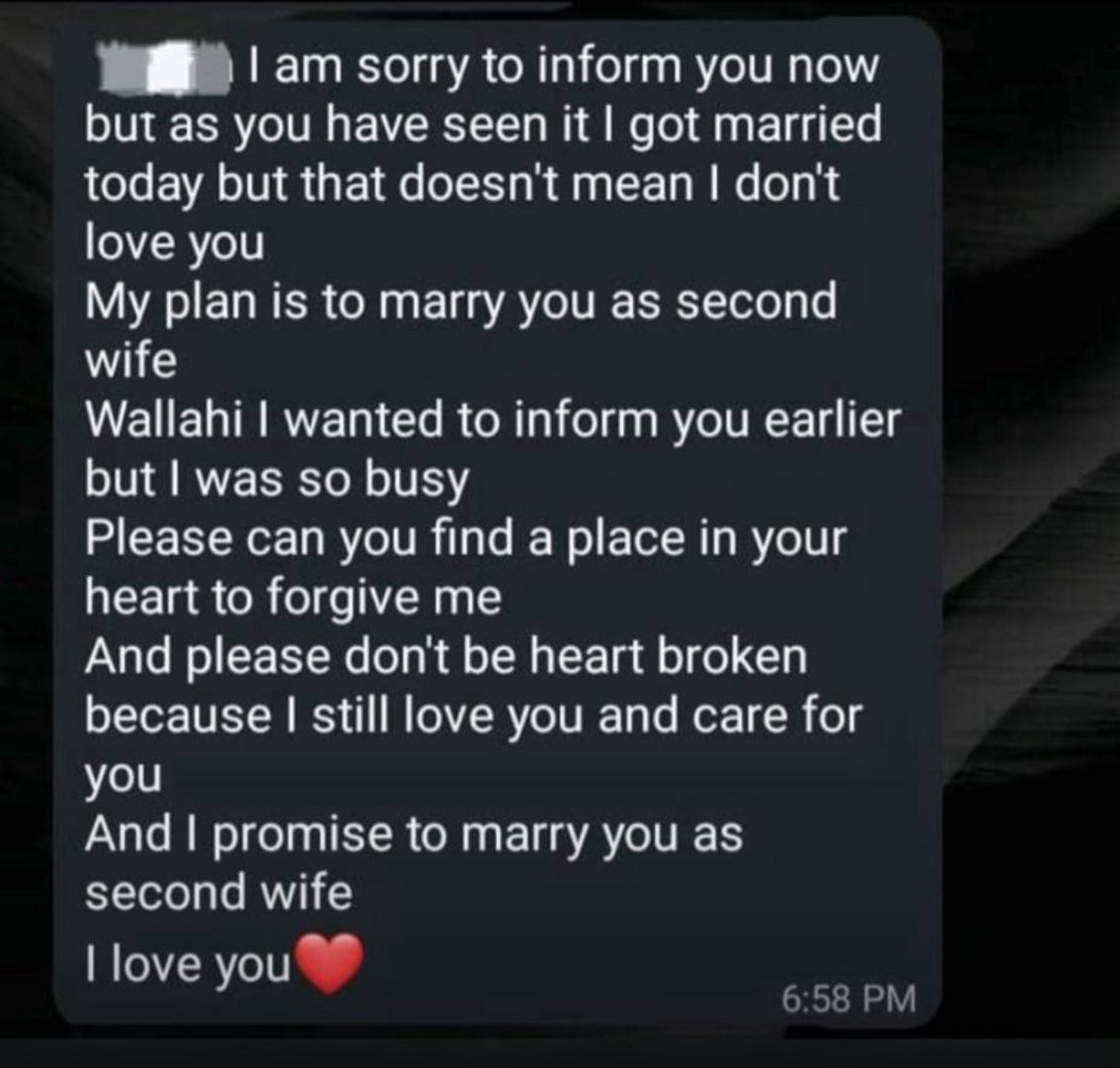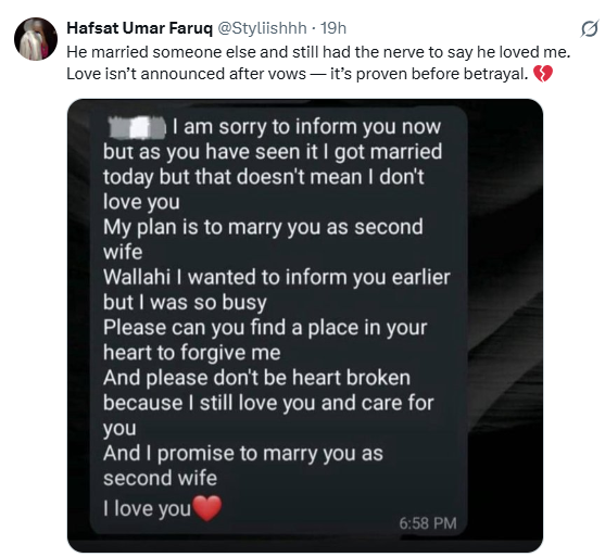 A Nigerian medical student, Hafsat Umar Faruq, has shared a message she received from her boyfriend, proclaiming his undying love for her and seeking forgiveness after he married another woman. Hafsat shared a screenshot of the message on Saturday, December 27, He married someone else and still had the nerve to say he loved me. Love isnt announced after vows its proven before betrayal, she wrote. In the message, the man claimed that he had wanted to inform her earlier about his marriage but he was too busy. He further claimed that he planned to marry Hafsat as a second wife. I 'm sorry to inform you now but as you have seen it. I got married today but that shouldn't mean I don't love you. My plan is to marry you as a second wife, he wrote. Wallahi I wanted to inform you earlier but I was so busy. Please can you find a place in your heart to forgive me. And please don't be heartbroken because I still love you and care for you. I promise to marry you as a second wife. I love you.