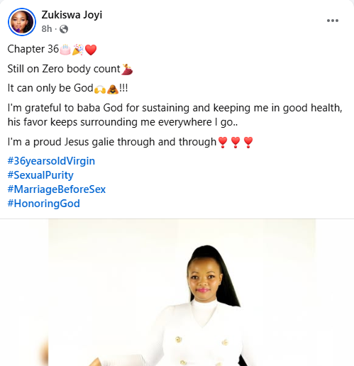 A 36-year-old South African woman, Zukiswa Joyi, who is a virgin, has gotten married. She shared photos from her Lobola ceremony in a Facebook post on Saturday, March 28, 2026. See what the Lord has done. What we waited for has come to pass. #BecomingMrsJili #NewChapter #36Yearoldvirgin #Jesusgalie, she captioned the post. The Durban University of Technology graduate has over the years shared her journey with s3xual purity. "Chapter 36. Still on Zero body count. It can only be God. I'm grateful to baba God for sustaining and keeping me in good health, his favor keeps surrounding me everywhere I go. I'm a proud Jesus galie through and through, she wrote on her 36th birthday. Zukiswa also revealed why she chose to remain a virgin at 36. A few reasons why I'm still on Zero body count at 36 or rather why I'm still a virgin 1. I'm a follower of Jesus Christ unashamedly, unapologetically 2. I don't believe in sex before marriage, besides that my Bible says it is God's will to remain s3xually pure 3. I'm not ready for emotional baggage from ungodly soul ties 4. I would love to only have Kidz with my husband not just a boyfriend 5. I'm breaking generational curses and it's a battle that requires purity all the way, she added