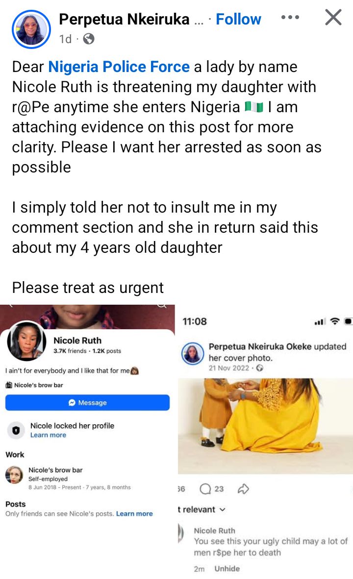 A Nigerian lady, Perpetua Nkeiruka Okeke, has exposed one Nicole Ruth, who allegedly commented on her daughter's photo calling the child ug*l and wishing men will r@p3 her. According to Perpetua, it all stared after she told the lady to quit insulting her in her comment section. "Good morning ladies and gentlemen. I am not one to go looking for peoples trouble. But this girl here @Nicole Ruth is wishing that men will grape my daughter just because I told her not to insult me in my comment section. Please anyone with a useful information about her should DM, she need to be behind bars ASAP," she wrote in a Facebook post on Sunday, February 15, 2026. I dont joke with my daughter and no idiot is allowed to say rubbish to her and walk away Scot free. Please if you know anything about her, send me a DM! People need to be thought a serious lesson on this facebook. Its everyone you play with on this space.