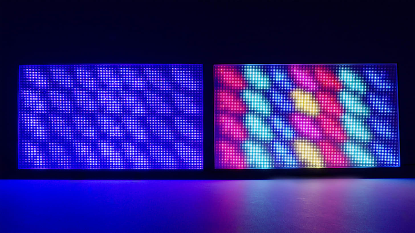 In the photo above, you can see a Sony Bravia 9 with its front LCD and color filter stripped off, revealing the bare backlight, which appears almost blue. On the right side, Sony’s True RGB backlight displays a color-matched backlight that forms a sort of low-resolution version of the image.