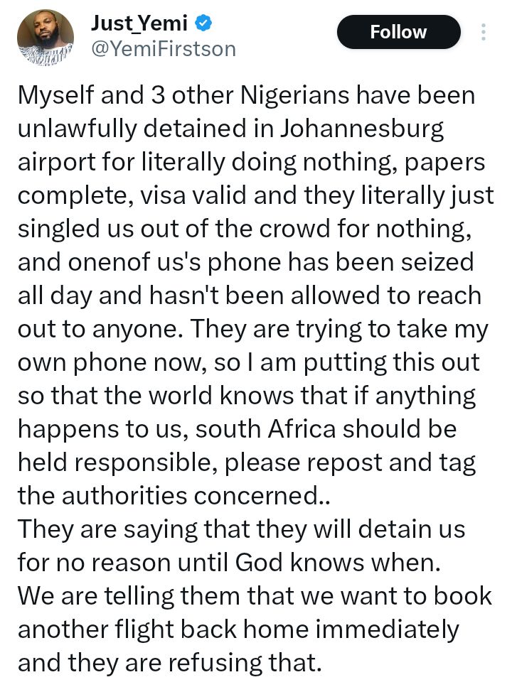 Authorities in South Africa have deported three Nigerian nationals after denying them entry over what officials described as insulting social media posts about the country's government. The incident occurred on Sunday, April 5, 2026 at O. R. Tambo International Airport. One of the deported travellers, a media personality identified as Yemi (@YemiFirstson) claimed in a series of posts that he and others had been unlawfully detained despite holding valid visas and travel documents. Yemi alleged that the officials singled them out, seized a phone, and initially refused their request to arrange an immediate return flight. He added that he felt unsafe and called for their prompt repatriation. South African immigration authorities confirmed the development in a statement titled Decisive Enforcement of Immigration Laws" and gave the reasons for their refusal of entry. "In your specific case, prior online posts containing insulting remarks about the South African government had already placed you on the authorities watchlist. Your inability to adequately explain or substantiate those statements during processing further aggravated the situation, the statement read in parts. The Nigerians in Diaspora Commission (NIDCOM) also confirmed the development, stating the affected nationals were expected back in Lagos on Monday morning. The commission advised Nigerian travellers to apply for visas through official channels or licensed agents, personally verify all application details, and carry supporting documentation when travelling. It also cautioned against the impact of online activity on immigration decisions. The Nigerians in Diaspora Commission (NIDCOM) is pleased to announce that the three Nigerian nationals who were stranded at a South African airport have been cleared and have departed South Africa. They are expected to arrive in Lagos tomorrow morning, the statement read. "While we welcome their safe return, NIDCOM notes with concern the circumstances that led to this unfortunate incident. "The core issue in many such cases stems from the over-reliance on unregulated visa agents. These agents often collect applicants passport data pages and complete sections of the visa application particularly on purpose of visit, itinerary, accommodation, and ties to Nigeria without the full knowledge or approval of the travellers. "Consequently, many applicants are unable to defend the information provided when questioned during immigration interviews, resulting in entry refusal. "In this particular case, one of the individuals had previously posted insulting remarks about the South African government online. This had already placed him on their watchlist. "When confronted at the port of entry, he was unable to defend or substantiate those statements, which further aggravated the situation. "NIDCOMs Advisory to All Nigerian Travellers:1. Apply for visas directly or through only licensed and verifiable agents. Never allow any third party to fill sections of your application without your full review and approval. "2. Ensure every detail submitted is accurate and that you can personally explain and defend it during any immigration interview. "3. Be mindful of your digital footprint. Immigration authorities, routinely conduct social media checks. Derogatory or inflammatory posts [about other countries or your home country] can lead to secondary screening or visa denial. "5. Always travel with genuine, well-documented reasons for your visit and carry all necessary supporting evidence. "NIDCOM will continue to monitor the situation and engage the relevant South African authorities to prevent recurrence of such incidents. "We strongly urge all Nigerians planning international travel to exercise due diligence. Responsible preparation protects not only the individual but also Nigerias reputation. NIDCOM thanks the Nigerian high commission in South Africa for their prompt intervention and will continue to follow up with the Ministry of Foreign Affairs and the Nigerian high commission in South.