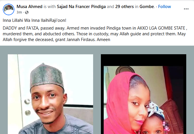 Suspected bandits have k!lled a prince and his seven months pregnant sister in Pindiga town, Akko Local Government Area of Gombe State. It was gathered that the assailants stormed a private home in the early hours of Saturday, December 27, 2025, k!lled Prince Yusuf Derdoski, popularly known as Daddy, his sister, Faiza, and abducted four other members of the family. The attack has plunged the town into deep mourning and shock. The Gombe State Governor, Muhammadu Inuwa Yahaya, has condemned in strongest terms the murder and abduction, describing it as barbaric, cruel and unacceptable. The statement issued by Ismaila Uba Misilli, the Director-General of Press Affairs, Government House, said security agencies have begun a manhunt for the perpetrators. The Governor said the k!lling of innocent citizens in their homes, alongside the abduction of women and children, is a heinous crime that deeply offends humanity and challenges the peace and security Gombe State has worked hard to sustain, the statement read. "This dastardly act is a direct assault on our collective conscience and a painful test of our resolve to protect lives and property. The Government and people of Gombe State share in the grief and anguish of the affected families and the entire Pindiga community. "He assured that the crime will not go unchecked, disclosing that the Nigeria Police and other security agencies have commenced intensive investigations into the killings and abductions. "The Governor directed that all necessary resources be deployed to track down the perpetrators, rescue the abducted victims unharmed, and bring all those involved to justice. "Reiterating his administrations firm commitment to security, Governor Inuwa Yahaya warned criminals and their collaborators that Gombe State will not serve as a haven for them. "He added that security operations will be intensified, intelligence gathering strengthened and collaboration with communities deepened. "The Governor urged residents to remain calm, vigilant and cooperative with security agencies, assuring the people of Pindiga and the entire state that the government stands firmly with them and will take decisive measures to ensure peace and safety. He extended his heartfelt condolences to the families of the deceased and the Pindiga Emirate, and prayed that Almighty Allah grants them strength and fortitude to bear the immense loss. He also prayed for the safe and speedy rescue of those abducted.