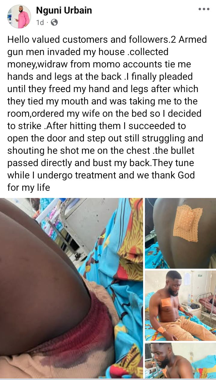 A realtor, Nguni Urbain has narrated how he was shot while defending his wife during a violent robbery at his home in Bunduma, Buea, Cameroon. According to Urbain, two armed men invaded his house, making away with cash, valuables, and money from his mobile account. The situation escalated when one of the attackers attempted to r@pe his wife, prompting him to resist. He hit the assailants and managed to open the door, raising an alarm. He was shot in the chest during the struggle but the bullet missed vital organs. The assailants fled shortly after. The victim is currently receiving treatment in a hospital in Buea. Hello valued customers and followers. 2 armed men invaded my house, collected money, withdrew from momo accounts, tied me hands and legs at the back, he wrote in a Facebook post on Monday, April 6, 2026. "I finally pleaded until they freed my hand and legs after which they tied my mouth and took me to the room, ordered my wife on the bed so I decided to strike. "After hitting them I succeeded in opening the door and stepped out still struggling and shouting. He shot me on the chest. "The bullet passed directly and bust my back. They tune while I undergo treatment and we thank God for my life
