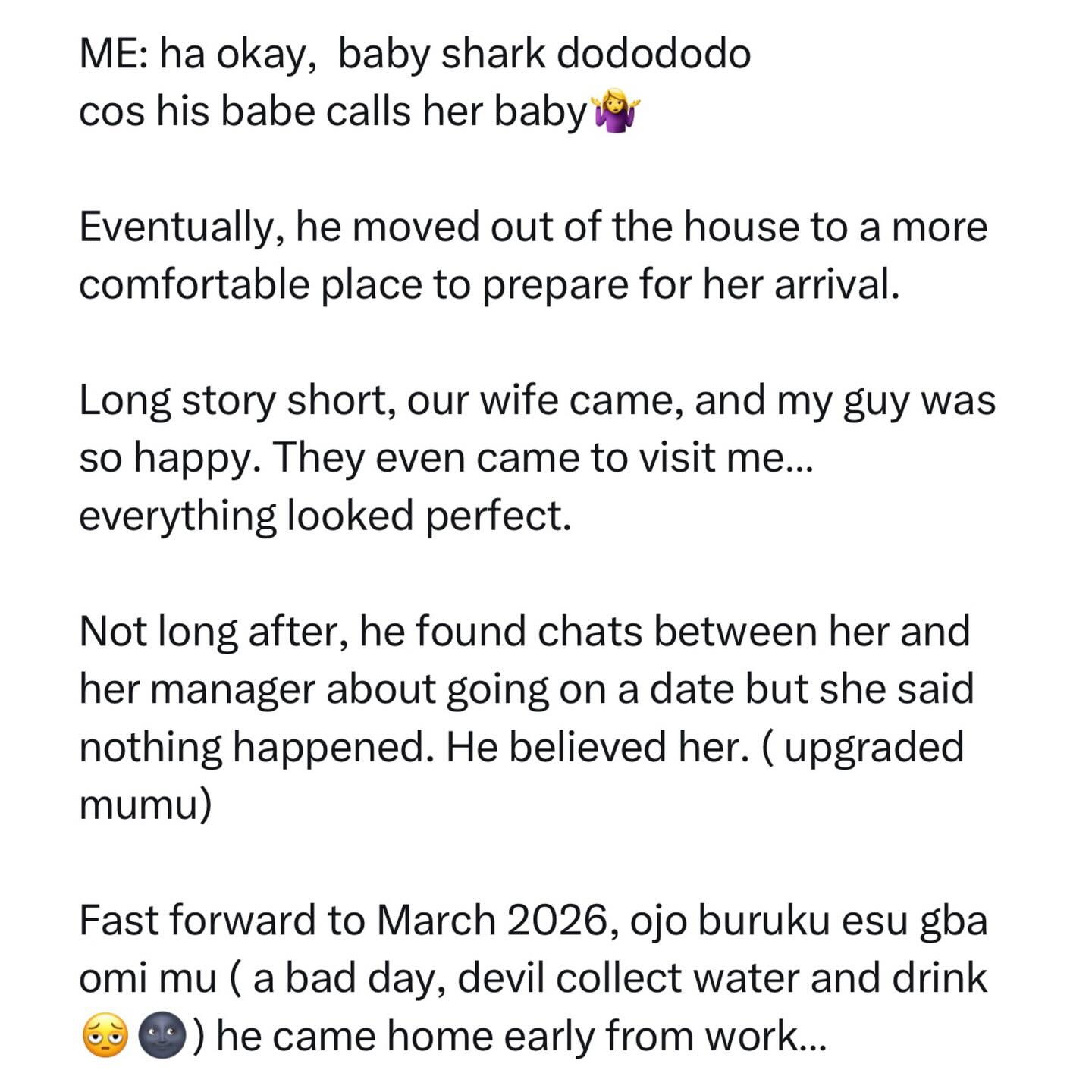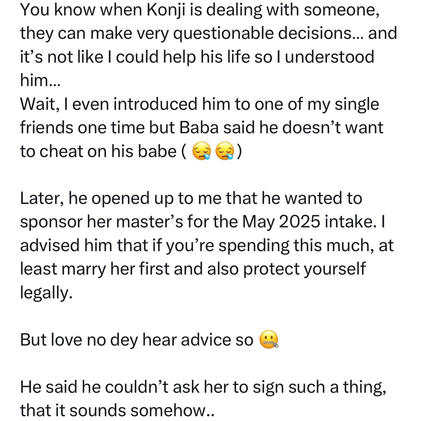 A Nigerian lady says only a mentally unstable man would sponsor his girlfriend to the UK without signing a prenup with her. In a post shared on her X handle, the lady with the handle @Olajumokeokenla recounted how her former roommate sponsored his babe to the UK for her masters, only for the lady to start cheating on him and when he found out, she got the police to arrest him. She said he is now being investigated for assault and safeguarding issues. Read her post below