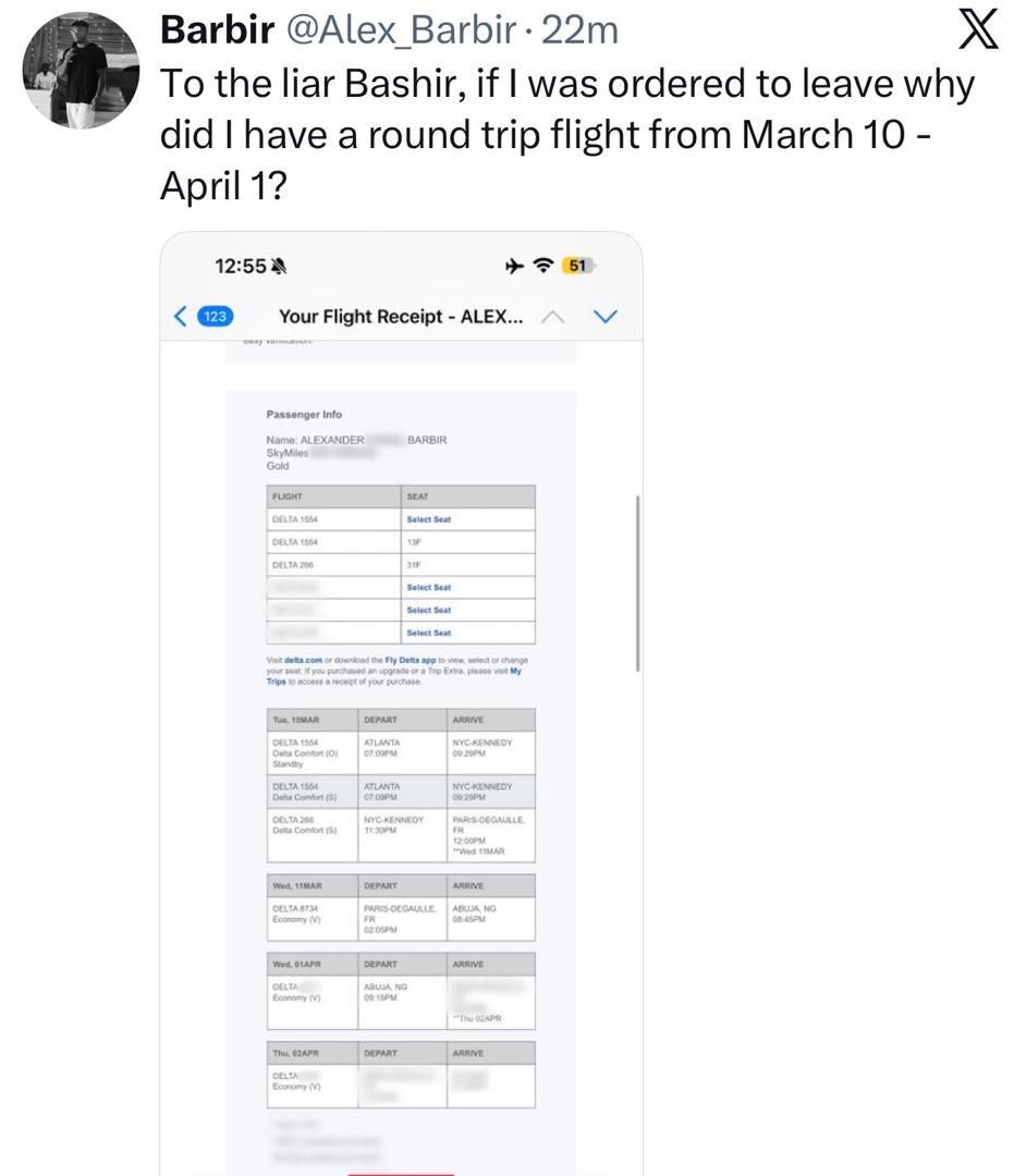 US Christian missionary, Alex Barbir, has denied claims by former presidential aide, Bashir Ahmad, that he was ordered out of Nigeria. In a post shared on X, Alex stated that he had earlier purchased his return ticket out of nigeria for April 2. He stated that his ticket was from March 10 to April 1. Bashir had earlier claimed security agents ordered Alex out of Nigeria. See Alexs post below..
