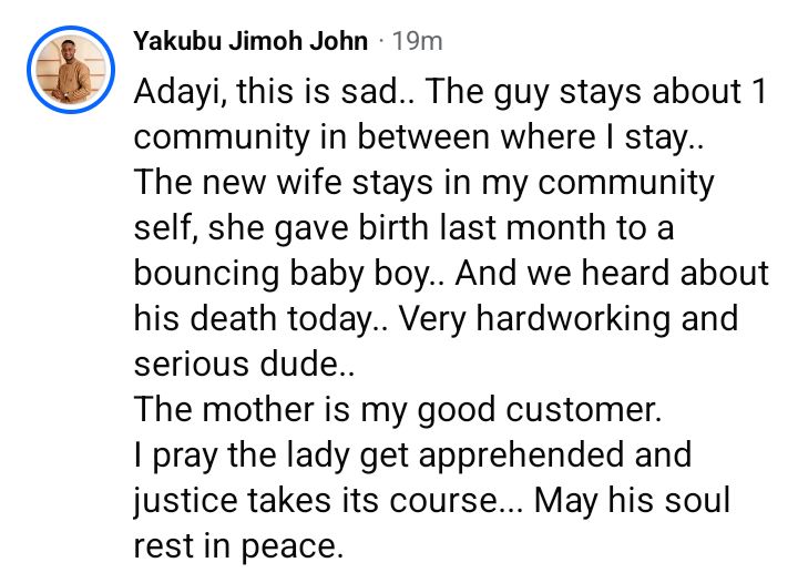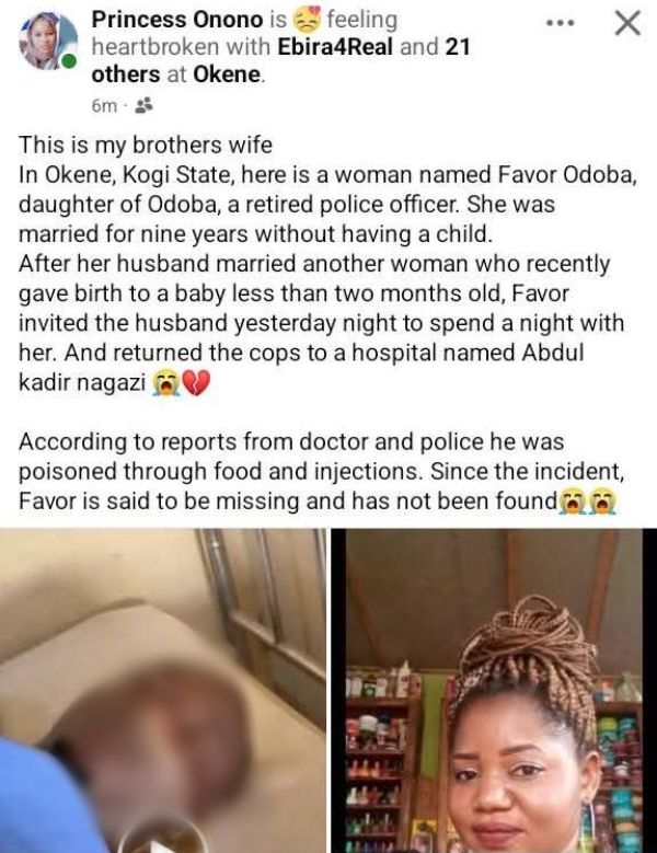 A woman identified as Favor Odoba, daughter of a retired police officer, has been accused of poisoning her husband, Abdul Kadir Nagazi, after he married a second wife in Okene, Kogi State. According to one Princess Onono, who claimed to be Nagazi's sister, the couple had been childless for nine years. Nagazi married a second wife who gave birth to a baby boy last month. She claimed that Favor invited Nagazi to spend the night on Saturday only for him to be rushed to the hospital, where doctors allegedly confirmed that he was poisoned through food and injections. Authorities say Favor is missing as investigations continue. Since the incident, Favor is said to be missing and has not been found.