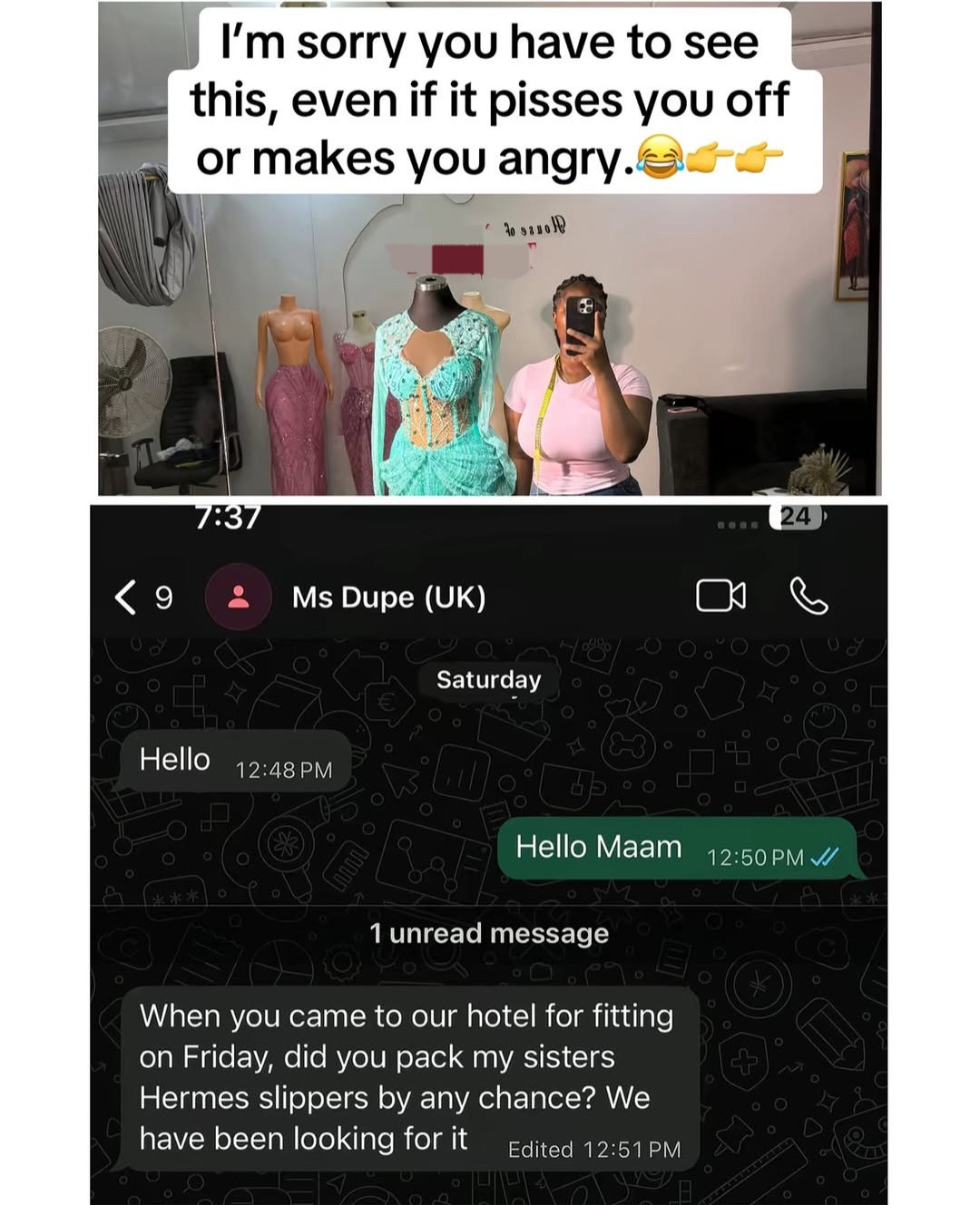 A woman has shared how a fashion designer reached out to accuse her of theft. The customer met the designer at a hotel for her fitting. However, when she left, the fashion designer sent her a message, asking if she took her sister's Hermes slippers. When the customer stated that she did not and hoped the designer would find what she was looking for, the designer told her that either the customer or the friend she came with must have taken the slippers. See the chat below.